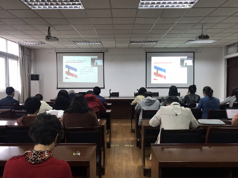 10月16日下午,著名教育专家、浙江外国语学院党委书记宣勇来我校作题为“高等教育的内涵式发展:理论与实践——习近平总书记教育重要论述学习体会”的报告。报告会由校党委常委、副校长时现主持。本次报告会以线下、线上同步方式进行,行政楼二楼报告厅为主会场,各学院(部)会议室为分会场。91制片 认真组织全体教师以“腾讯会议”的方式与讲座现场同步连接,以学院会议室德济楼408作为分会场进行集中学习。