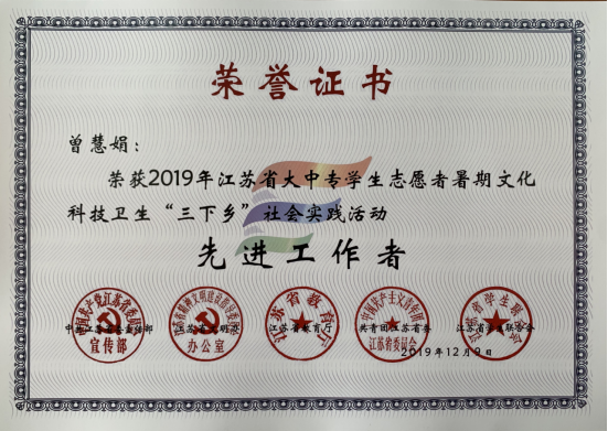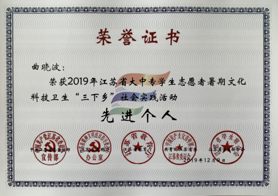 日前,江苏省委宣传部、江苏省文明办、江苏省教育厅、共青团江苏省委、江苏省学生联合会联合下发《关于公布2019年全省大中专学生志愿者暑期文化科技卫生“三下乡”社会实践活动先进集体和个人名单的通知》(团苏委联[2019]24号),我院人资1701班曲晓波同学荣获“先进个人”称号,分团委书记曾慧娟老师荣获“先进工作者”称号。