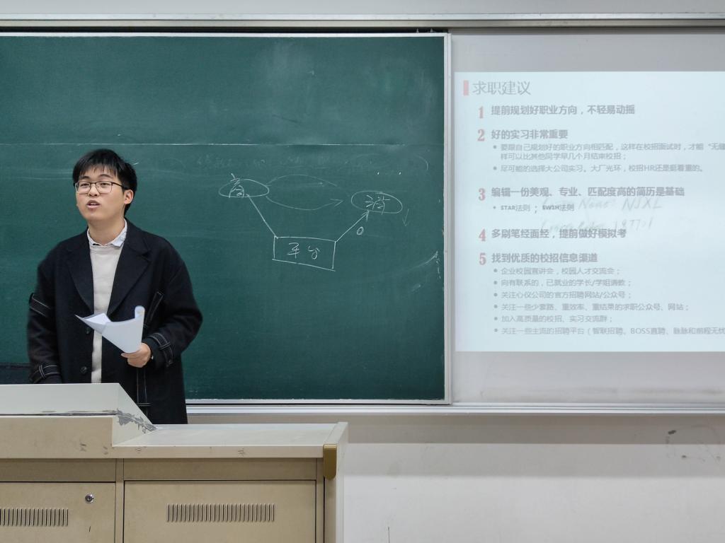 于博文楼203教室开展了“‘职’引人生”就业经验分享交流会,活动邀请了已成功签约中建八局总承包建设有限公司的陈相国、南京市江宁区人力资源和社会保障局的周颖和中海油能源发展股份有限公司的张婧盈三名2023届毕业生作为嘉宾分享就业经验,与同学们进行答疑交流。91制片