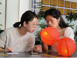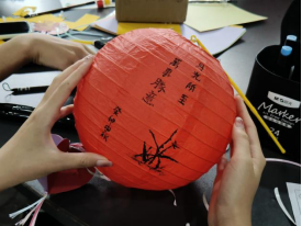 中秋花灯承载着人们对生活的美好祝愿。活动伊始,主持人钱媛媛同学向大家介绍了中秋节和花灯的由来及寓意,拾起大家对传统文化的回忆。随后,同学们开始制作花灯,墨笔写下平安喜乐、万事顺意,彩色画笔勾勒出中秋月夜的别样多姿和对祖国母亲的深情告白。彩纸慢慢糊上竹骨,花灯初见雏形,放入电子灯,固定好灯笼杆,花灯就制作完成了。同学们在祝福签上写下自己的寄语,表达对亲朋的诚挚祝愿和对未来的美好期许。点点灯火中,所有的心都汇聚成一片浓浓的家国之情。