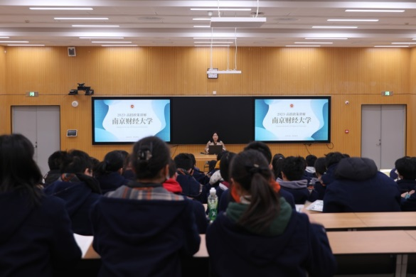 ”视角,介绍了我校创新实验班选拔、会计学(ACCA)实验班的培养、我校的文体活动、校园风景、校园周边、学在南财、食在南财、住在南财等情况;吴婧欢同学分享了自己进入大学以来取得的进步和收获,鼓励学弟学妹们坚持梦想,努力学习,度过充实而有意义的高中三年。互动环节,学生们踊跃提问,现场气氛热烈。