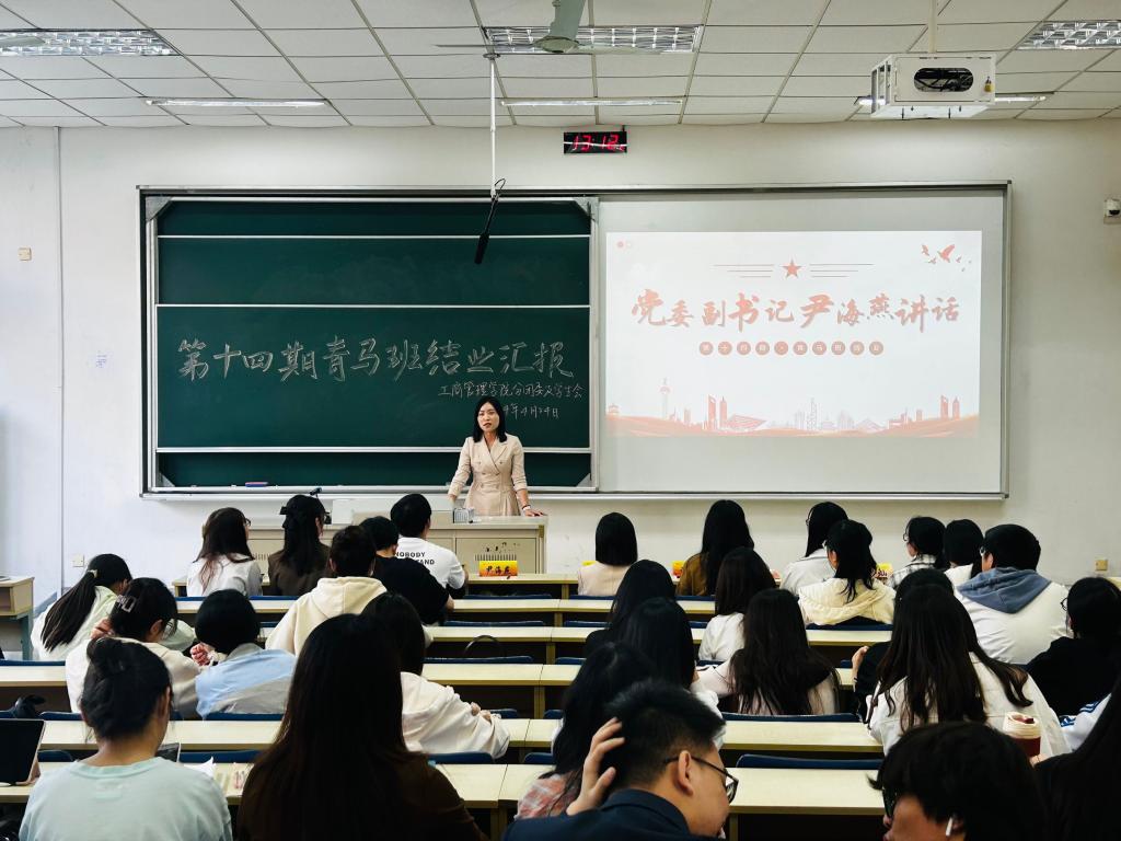 党委副书记尹海燕老师进行总结发言。她对本期青马班学员在结业汇报中展现出的优秀综合素质给予肯定,对各小组全面展现成员的个人学业发展、志愿服务实践、学科竞赛参与提出表扬。此外,尹海燕老师也对大家提出两点期望:第一,希望各小组在参与青马班活动之余积极主动组织马克思主义思想理论学习和实践活动,将理论学习贯彻到个人的学习生活中;第二,希望学员们做好马克思主义的传承者和传播者,努力投身学业和各项高质量学科竞赛,将在青马班的所学所知应用到实践中,将个人发展和学校、学院发展相结合,将个人理想融入实现中华民族伟大复兴的中国梦。
