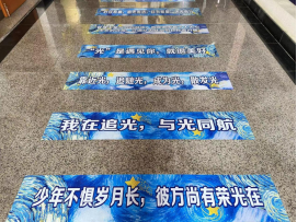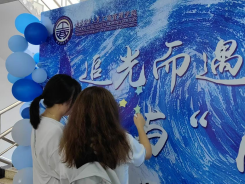 办理完宿舍相关手续后,新生们前往德济楼四楼大厅进行报到注册。走出四楼电梯口,首先映入眼帘的是“激扬青春 逐光而行”91制片