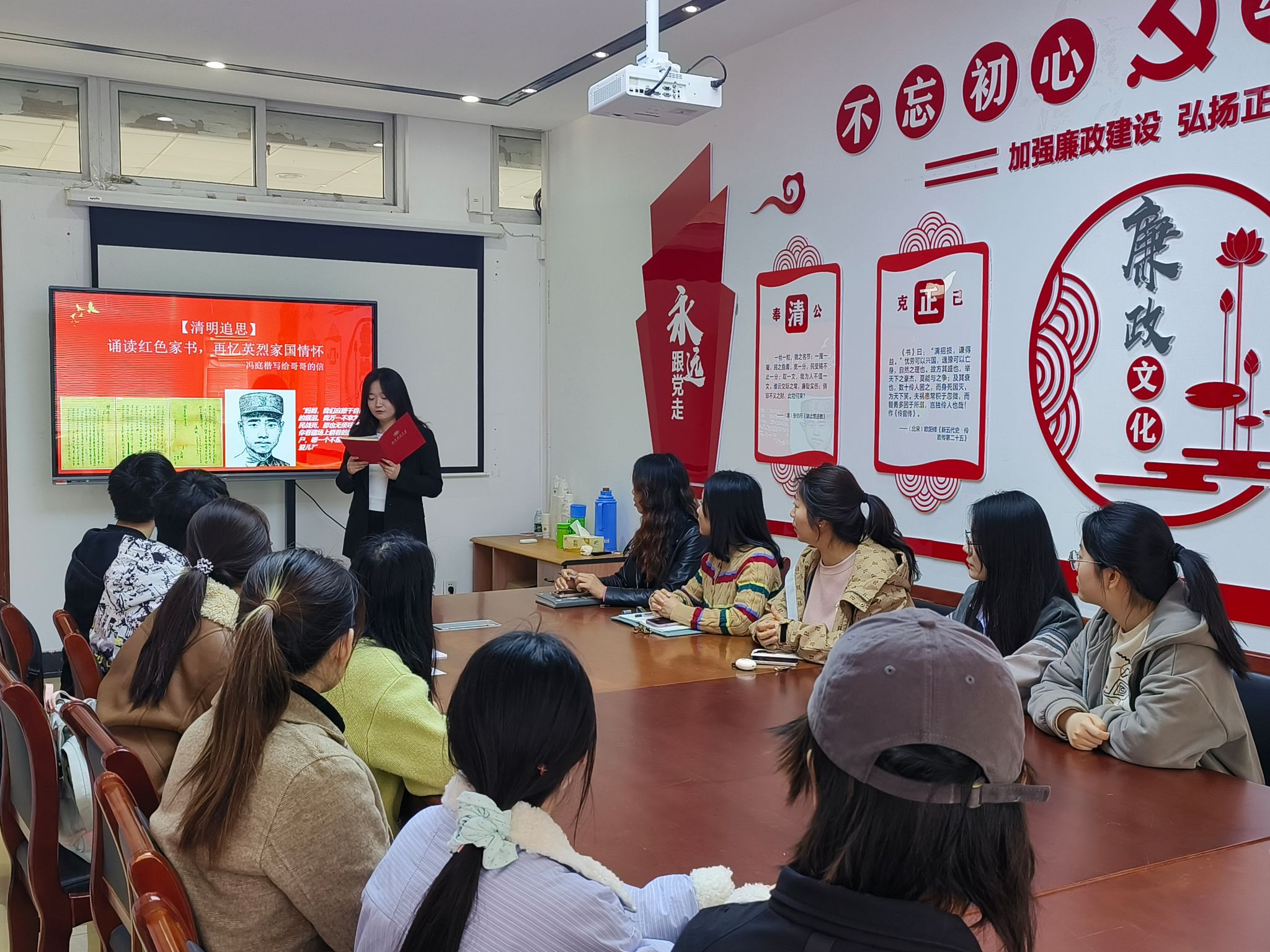 在德济楼403会议室开展“清明追思·红色家书诵读”主题党日活动。青年党员蒋雨函同学深情诵读了《冯庭楷烈士致兄长家书》,“弟毅然走出饥寒家庭参加八路军”“若为人民战死,无须呼哭”等语句在党员师生的心灵深处回响,泛黄信笺上的家国抉择令在场者动容。这封家书既有青年学子“始终跟党走”的坚定信念,更饱含“妈妈应擦干眼泪”的骨肉深情,是清明追思最鲜活的教材。党员师生们纷纷表示,清明不仅是缅怀英烈的时刻,更是精神接力的起点。我们更需以青年的责任与担当传承薪火,从英烈小我与大我的抉择中,读懂“青春该以何为荣”的永恒之问。