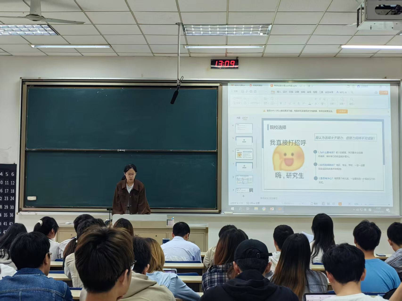 在德济楼101教室成功举办“上岸攻略+职场密码”首场毕业生升学实战分享会。院分团委书记赵雪、2022级本科生辅导员常莹、2023级本科生辅导员朱静坤以及学院部分学生共同参与了此次活动。