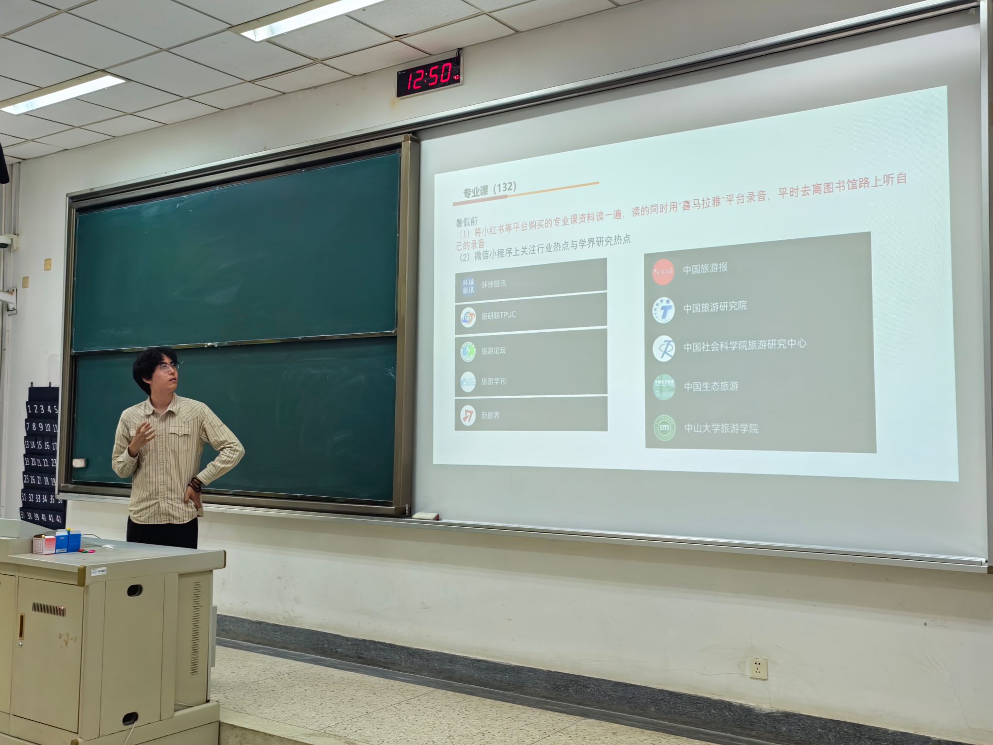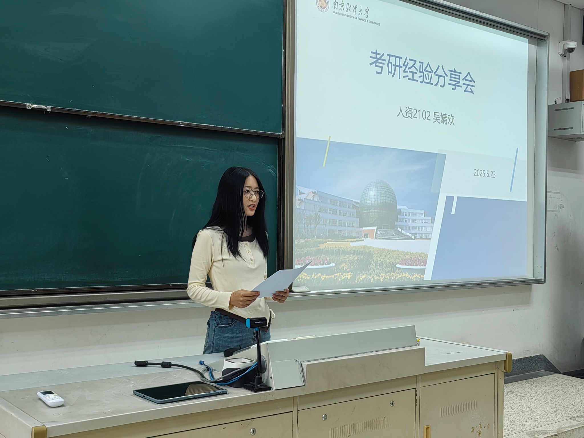旅游2101班符世祖首先分享了自己考取中山大学旅游管理专业硕士研究生的经历,他强调了信息收集的重要性,推荐了有效的学习软件,并详细讲解了备考时间安排的方法;人资2102班吴婧欢结合成功上岸南京理工大学企业管理专业硕士研究生的经历,提出了择校需综合考量个人实力、兴趣及未来职业发展方向的观点;工商2102班陈苏菲分享了自己如何克服数学基础薄弱的难题,最终考取吉林大学企业管理专业硕士研究生的历程,并鼓励大家找到适合自己的学习节奏;最后,工商2101班丁陶梦渔分享了申请英国布里斯托大学管理学国际商务专业的宝贵经验,提醒有意向留学的同学必须密切关注官方信息,以防因中介的失误而错失良机。