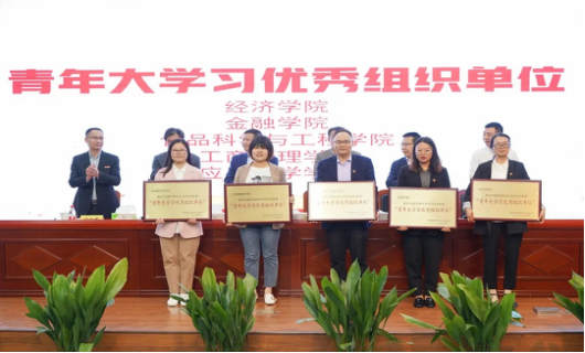 团委书记曾慧娟老师(前排左二)代表学院领取“青年大学习优秀组织单位”奖牌