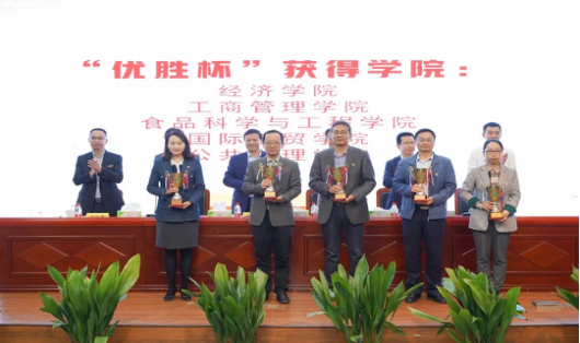 党委书记杨林老师(前排右二)代表学院领取“优胜杯”