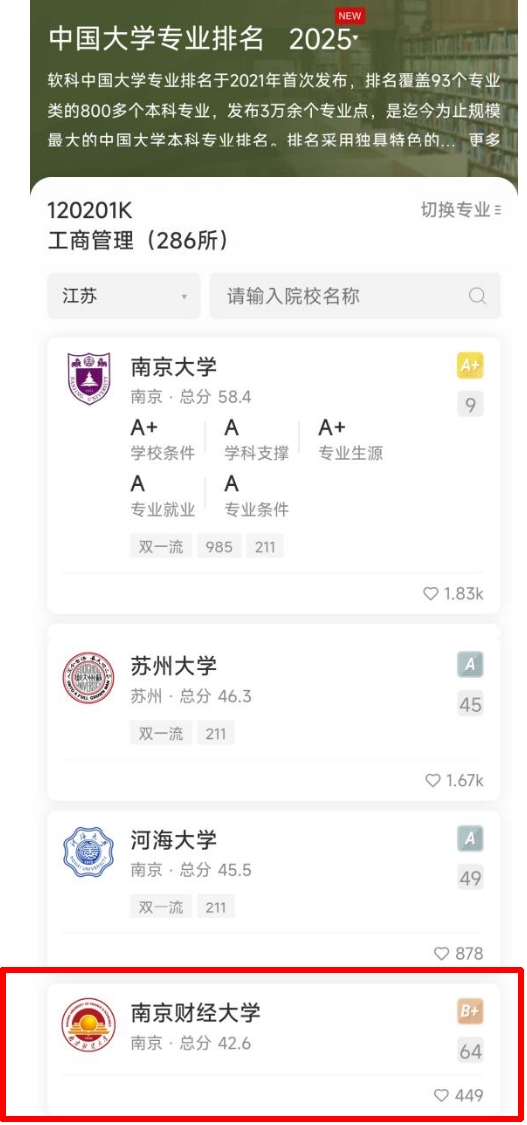 旅游管理专业荣获A等级,全国排名第22位,全国财经类高校第5位,位列江苏省第1名;人力资源管理专业同样获A等级,全国排名第28位,位列江苏省第3名;工商管理专业获评B+等级,位列江苏省第4名。