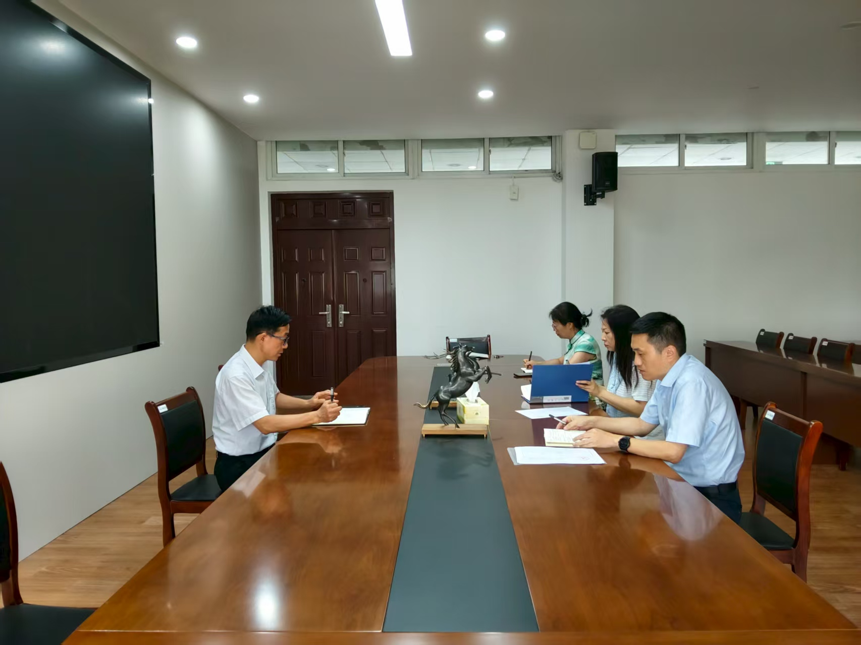 副院长张文勤详细汇报了工商管理(环境商务)合作办学项目自评报告及佐证材料的准备情况、存在的问题以及相关人员在迎评工作中的分工情况。