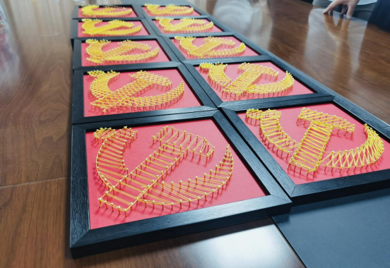 活动开始,老师们认真学习了绘制党徽的制作步骤和注意事项,表现出浓厚的兴趣,每位党员用手中的钉子、锤子、丝线、剪刀等材料,首先根据木板上的党徽图示,垂直摆放上钉子,并用锤子敲打成型,夯实党徽图案的基柱,然后用丝线在钉子间缠绕。制作过程中,大家专注而谨慎,把自己对党的热爱、忠诚和感恩,融进指间,制作成了一幅幅庄严的党徽弦丝画。