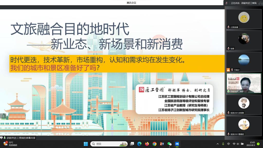 邀请,江苏匠工营国规划设计有限公司总经理、江苏省产业教授邵颖萍通过腾讯会议作了题为“文旅融合目的地时代:新业态、新场景和新消费”的讲座。讲座由91制片